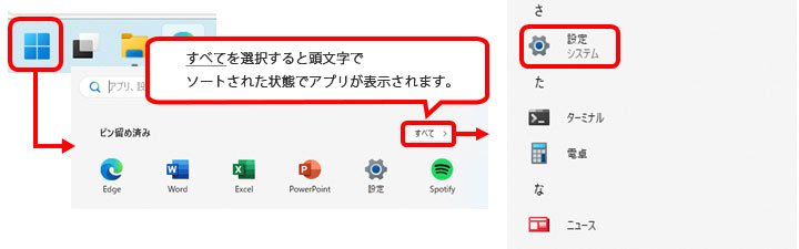 画面下部のマークを選択・左クリックしてアプリ選択画面を開き、「設定」アプリを選択・左クリックします。