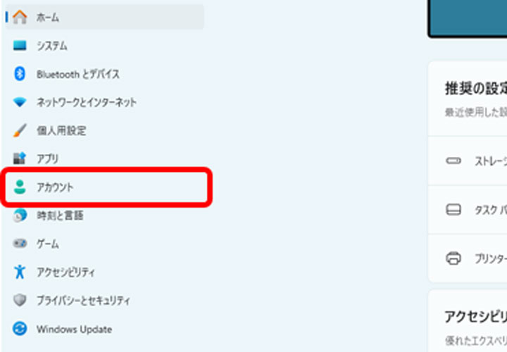 「アカウント」を左クリックします。