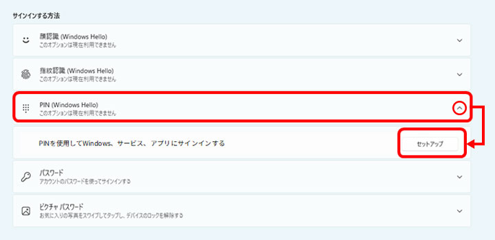 PIN(Windows Hello)を左クリックし、配下の項目を表示させます。