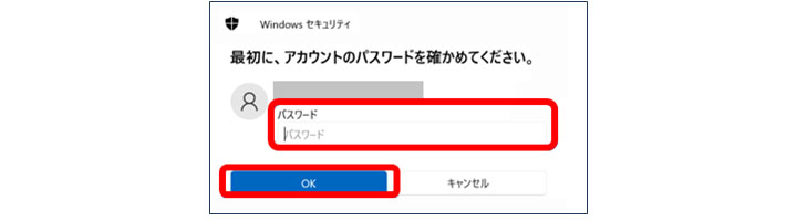 パスワード入力画面が表示されるので、「Microsoft(Windows)アカウントのパスワード」(※4)を入力し、「OK」を左クリックします。