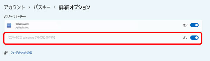「パスキーをこのWindowsデバイスに保存する」が表示され、「オン」になっていることを確認してください。